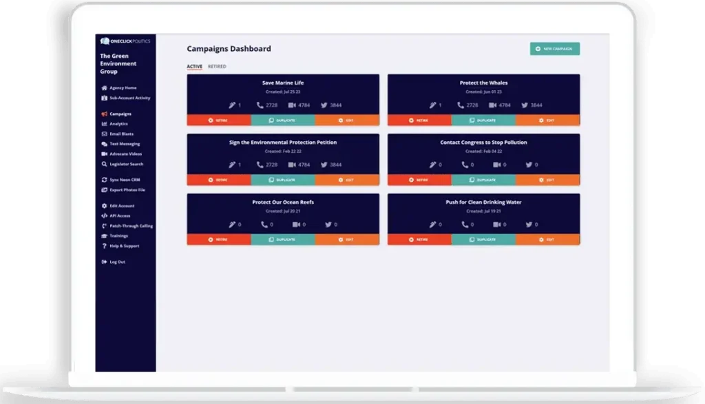 One Click Advocacy is our flagship advocacy software platform, which includes innovative communications tools such as photo and video messaging, integrated text messaging to advocates, direct social media posts to legislators profiles, rotating email messages, auto-population of advocate data into our webforms, and much more!